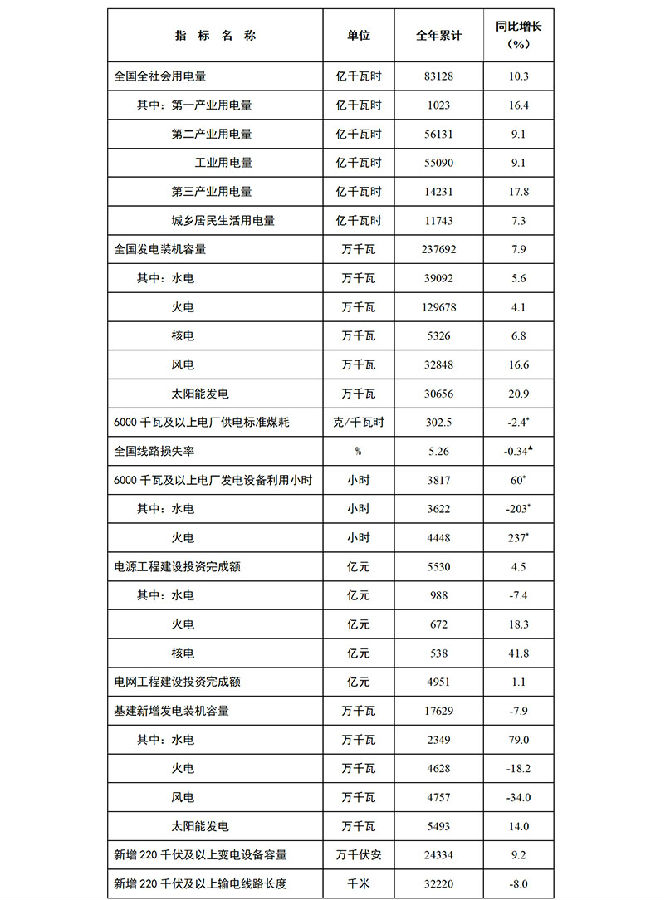 2021年,全国6000千瓦及以上电厂发电设备利用小时3817小时,比上年同期增加60小时。全国主要发电企业电源工程建设投资完成5530亿元,同比增长4.5%,其中,水电988亿元,同比下降7.4%。电网工程建设投资完成4951亿元,同比增长1.1%。